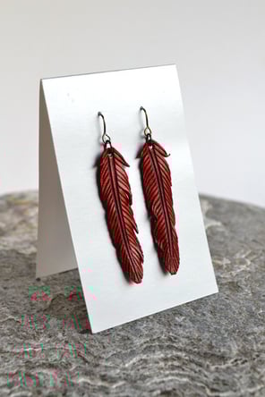 These Feather Earrings are individually hand carved out of vegetable-tanned natural russet leather. They are hand dyed and sealed.